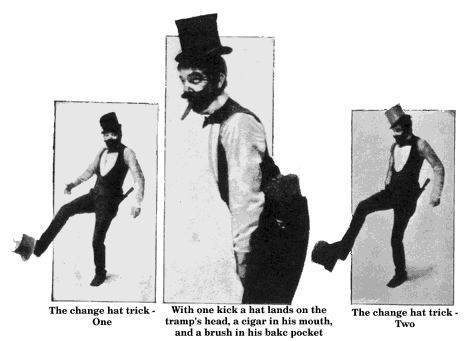 Another very good trick is with two tall hats, a black and a white, both more or less dilapidated. One the juggler places on his head and the other on his outstretched foot. Simultaneously he jerks the latter up onto his head, and drops the former on to his foot. Like all good tricks, it looks very simple, and isn't. Then he turns his attention to a hat, a cigar and a whisk brush. For this he utilises a large pocket at the back of his trousers, just below the waist. He tosses the articles about in a similar manner to the tennis balls, and finally gets the hat on to his head, the cigar into his mouth, and the brush into his back pocket.