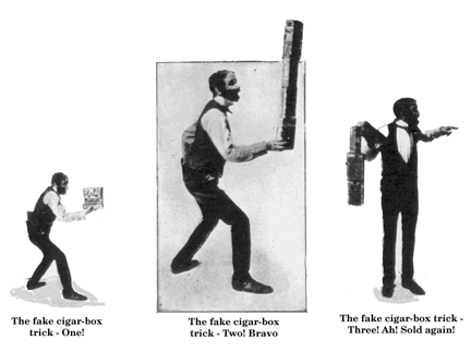 Mr. Fields, who is assisted in a measure by a young and attractive lady, does not crowd the stage with apparatus. In fact, there is little to be seen when the curtain goes up. Just a small table on which there are a few cigar-boxes. The latter, however, supply an opportunity for some really remarkable tricks in dexterity which set at naught all the laws of gravitation. Mr. Fields takes six or eight of the boxes and holds them together horizontally between his hands; he then proceeds to detach them one at a time by hitting them sharply on the top, retaining the horizontal position till they have all been dislodged. He does it with such speed and precision that it appears as easy as amorously saluting your hand. He can also as readily readjust them, and with such neatness that the boxes would appear to be coated with an adhesive substance. That, however, I assure you, is not the case, for the only "deception" which Mr. Fields brings to bear upon his tricks is the incessant practice, which, as we all know through the medium of proverbial philosophy, makes perfect in almost anything.