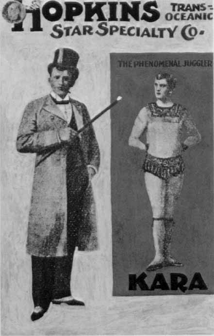 Poster from US tourKara, whose real name was Michael Steiner, was born on January 31st 1867 in Nuremburg, Germany. As a child he practiced juggling household objects, and when he was sixteen years old he was juggling at his parents' fried fish stall when he was spotted by theater owner August Schichtl, who started him on a performing career. At first he juggled balls, knives, bottles and torches and dressed in the standard acrobatic costume of the day, but a few years later he began to experiment with the possibilities of juggling a top hat, a cigar and a cane.