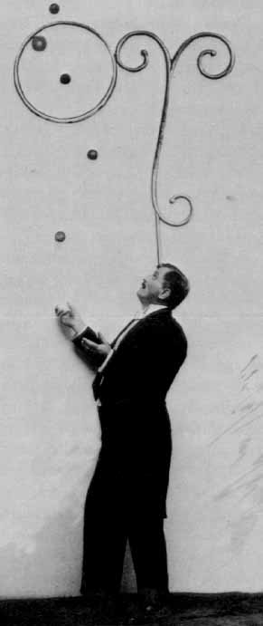 Balance and ballsBut in fact, at the time when the Italian appeared on the scene, Kara had already long vanished from view. It was not resignation that drove the celebrated "gentleman juggler" of the turn of the century into loneliness and withdrawal; rather, he fell subject to the natural law which commands all performers to vacate the stage when the nerves have been exhausted. It would be fundamentally wrong to assume that Kara may have watched Rastelli's career enviously, for his own active life was rich with triumphs. More than thirty years separate Kara's heyday and the heyday of "The Miracle of the Dancing Balls," but they could not have been considered rivals even if they had worked at the same time, for their presentations were so widely dissimilar. Alone their respective ways of coming on stage, if one considers well, must be taken as proof of the fact that there can hardly be greater dissimilarity between two jugglers: Rastelli made his entrance with a ballet leap to the footlights, throwing the ball; Kara remained invisible for half a minute after the music had stopped, then sauntered out, from the wings with the nonchalance of a man whose motto is that success can only be achieved through calm and quiet. Rastelli was the personification of effervescent temperament and whirling life, though these were tamed in those phases of his work in which he had to assume a restful attitude, which is to say in the balancing feats which constituted such a considerable portion of his performances. But save for these immobile moments, everything about him was tireless movement: the astounding mechanism or his hands, his head - indeed, of his whole body - ran on irresistibly as though in perpetual motion. The most minute pause was filled with the restiveness of this dancing juggler, who seemed to have not two eyes but a hundred, and who accumulated a treasure of spectacular achievements. But Kara could claim no less of a treasure, save that in his case the method was different: his were the restrained, subdued manners of a gentleman in white tie and tails moving in measured steps across the stage. The difference was one between a 100-yard-dash racer and a leisurely promenader, both of whom, in some miraculous way, manage to cover the same distance in an equal span of time. There were no dead moments during the performance of the man in formal attire, either; even while his left hand was still juggling the four coins, which would finally flow delicately into a vest pocket, his right hand was already reaching toward a table on which rested a top hat on which in turn rested a burning cigar - and with one gracious sweeping motion, the hat landed on his head and the cigar between his lips. All Kara's action was en passant, a passing stream; his performance was a chain of astounding surprises for the spectator.