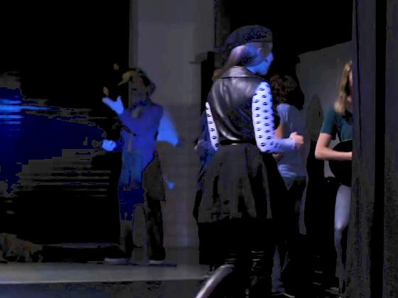 in the dimly lit background, seen in 2 shots over a 20 second period.