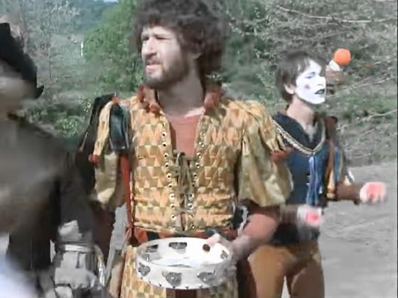At 0:02:46, during the opening credits, a jester walks across juggling