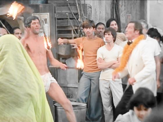 Roger Moore, as James Bond, steals one of the torches to use it to fight